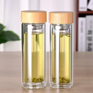 Double Wall Insulated Borosilicate Coffee Glass Cup Set Bamboo Glass Water Bottle